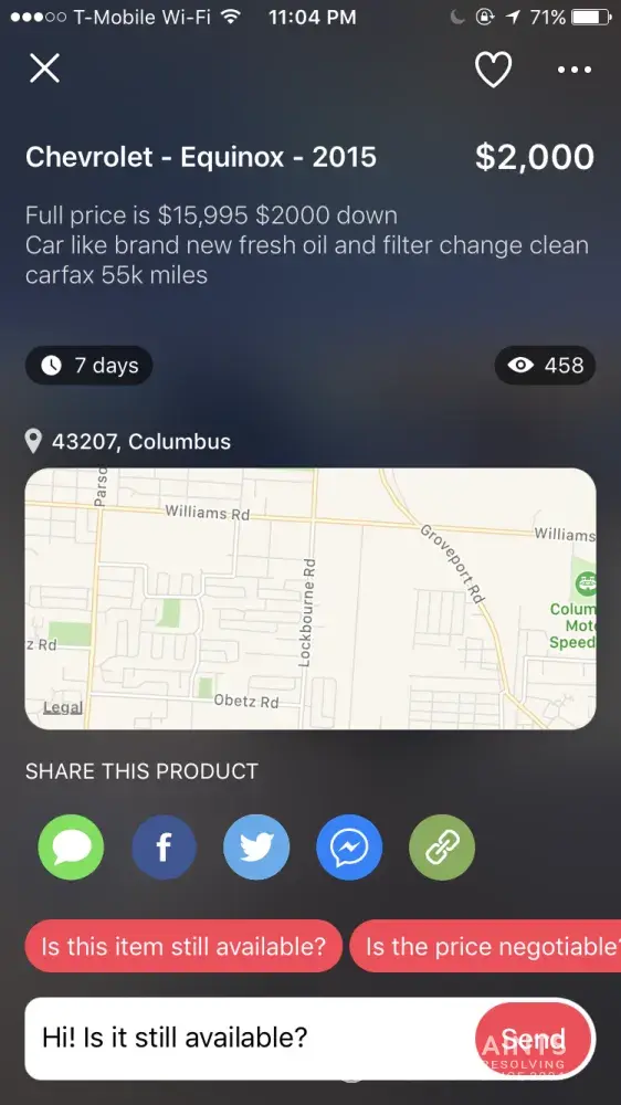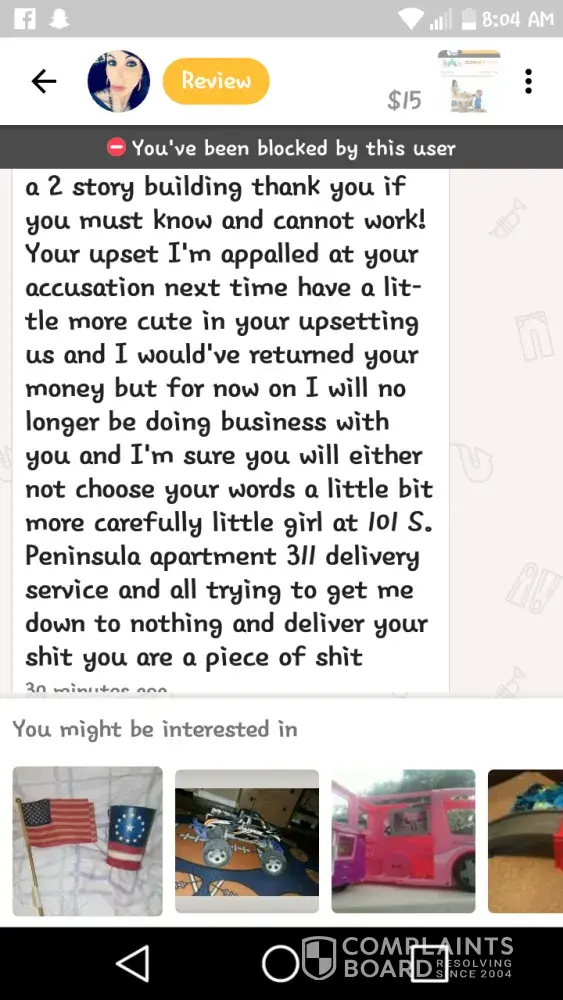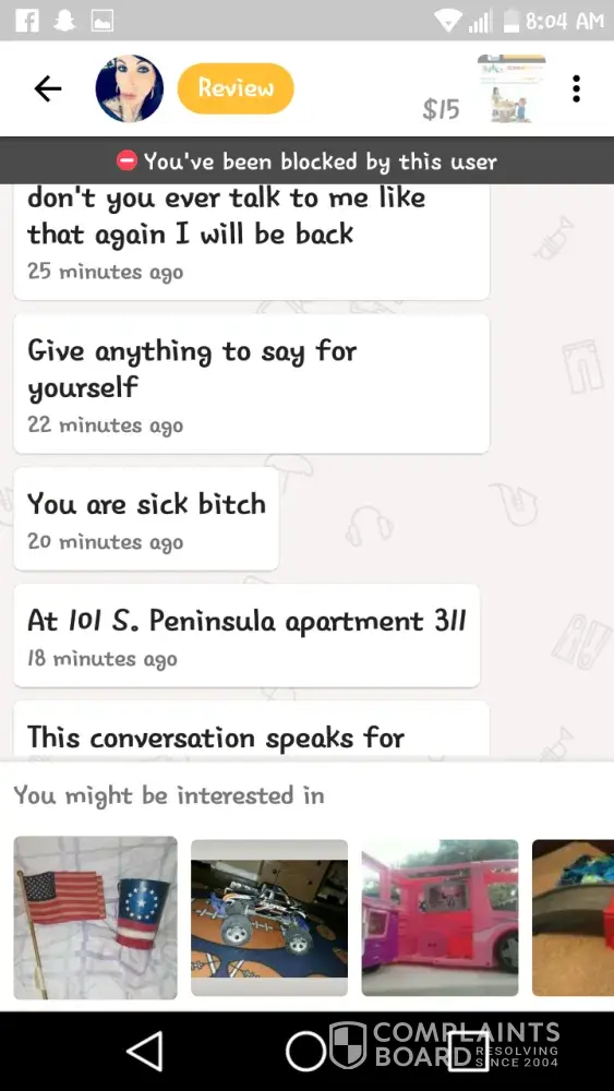 Making this quick as I can... I bought a toy table and a pair of jeans from this crackhead. She was so loud and boisterous when she got to my home at almost 10:00 at night yelling my apartment # up at the third floor and yelling up the stairs. She was obviously extremely high on somthing. I bought the items as quickly as possible to make sure no one else in the building was seeing this happen. I told her the next morning which is today that after I got done cleaning the table which was festering with spiders and roaches and roach eggs underneathand crawling live roaches ! That she was disgusting and I feel she sold her childs toys for drugs. Whether I was right (which I pretty sure I am) or not she then continued to type out a good line of threats to me mentioning my address and she will be back and how dare I say that...this is bullcrap. Its obvious you cannot judge from just a photo and text of a person. Like Craigslist you had to call and talk to the person in order to do a transaction...well this is not good and I'm considering deleting your app or you need to do something about her name is (colleen) dont know if that is spelt correctly. This is dangerous