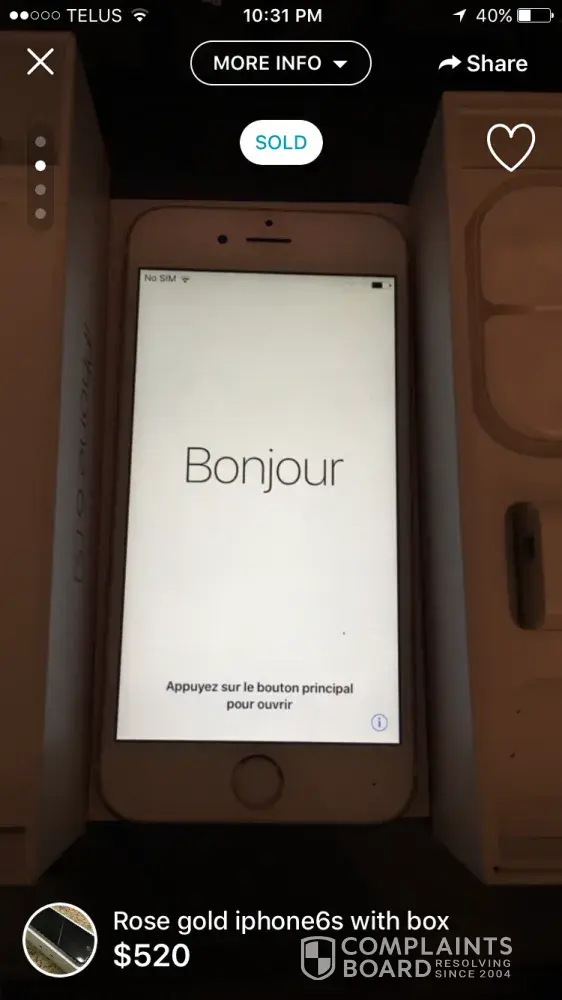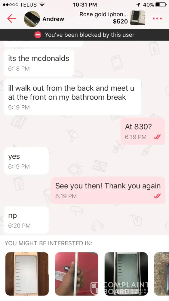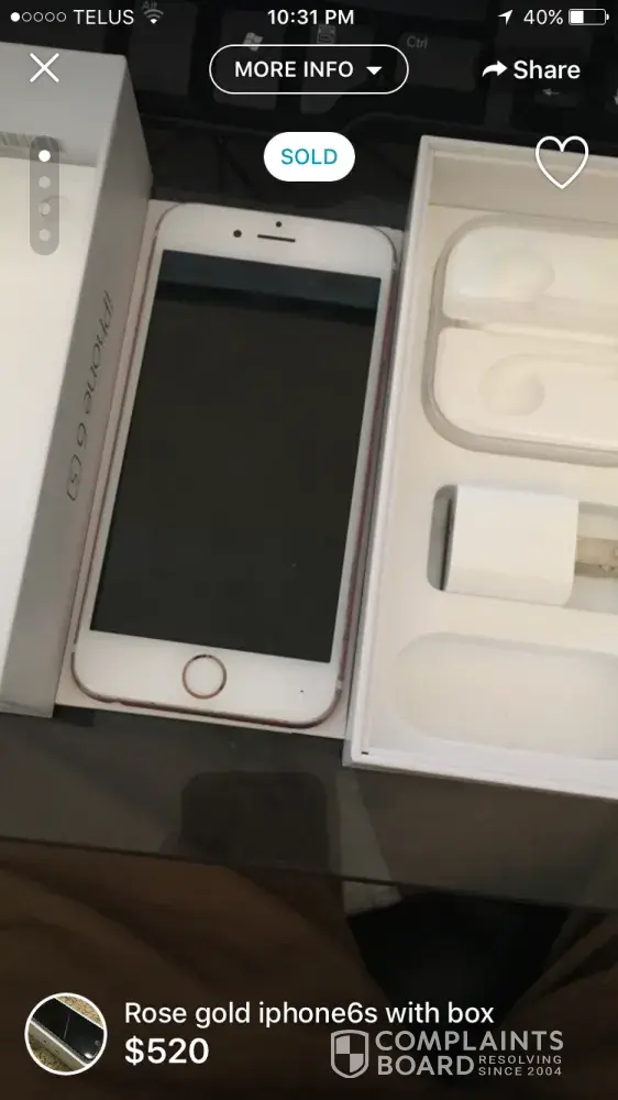 I was under the belief that I was buying a brand new iPhone 6s and was ready to pay 400$ for it. I showed up at the meeting place in Kitchener Ontario and saw the phone. Phone looked to be good and I handed over my 400$. The guy left in a hurry. I was told that the iPhone was unlocked to all companies and returned home to find that my sim did not work inside the phone. I searched the imei number to see what the status of the phone is and it is a stolen device. I am very disappointed and upset that I am now in possession of a stolen device and i think that you should give me my 400$ back... for anyone that is selling phones on your site should have to enter imei number to ensure that there is no illegal activity going on. I am very disappointed that letgo does not have security measures in place to prevent people breaking the law and having other people dragged into it. I would like you to refund me my 400$. Please find attached the images of the sellers ad. After the fact I was going to message him only to find that he had blocked me as soon as the deal was made.