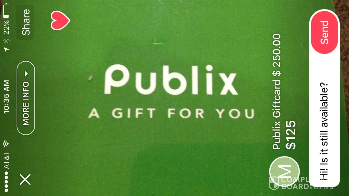 We carried on conversation regarding me puchasing it. I requested he meet me at the publix store to verify amount on card and I'd give him the cash at that time. He said he would.