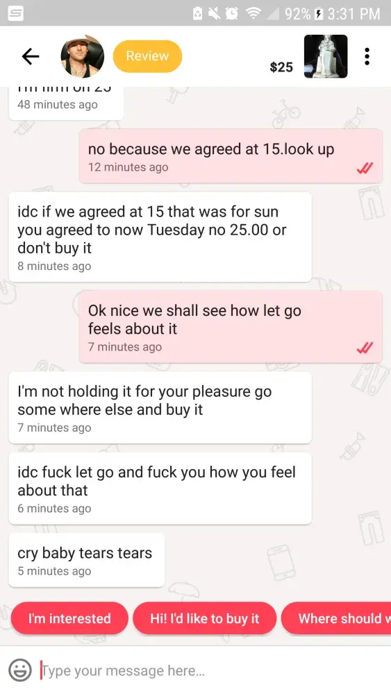As seen in the added photos below. Allen and I agreed on a price on a item 3 days ago. I informed him I wasn't able to pay til, 3 days later. He paused but never said no. It's payday I contact him and he upped the price. When I inquired I got attitude. I said we will see what let go has to day about this and then he got volger and cussed at me again see able in pics below.