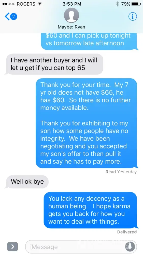 A customer review was posted on my profile, regarding a 46inch RCA cabinet style hdtv. i listed it at $375. A potential customer asked if I would accept less and I agreed. I asked them to make an offer. They responded back with $ 100. i responded that I would not sell at that offer. Their immediate response was to post a review stating that I was posting unfair prices. I placed the review up for exam by letgo. Noone is holding a gun to these people, forcing them to purchase anything. Just because she claims she found another TVof comparison, doesnt mean I need to reduce my asking price to satisfy her. This is totally unfair and against free market capitalism.