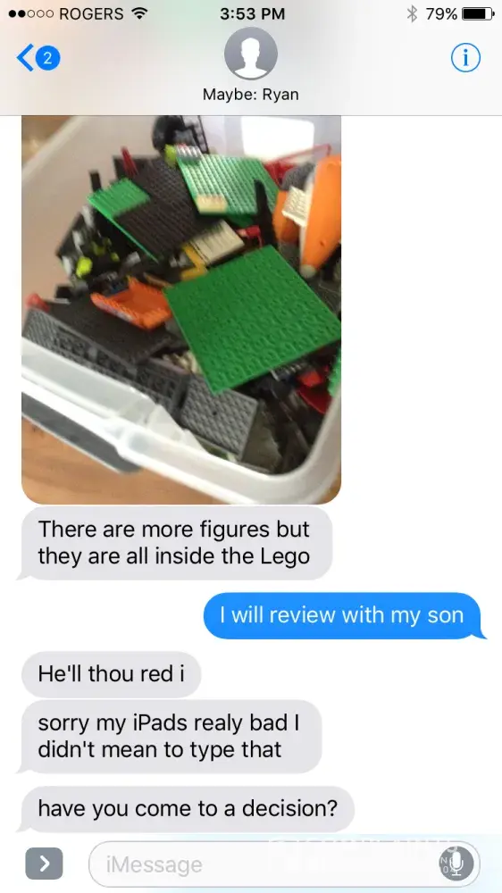 I had inquired with one seller, UltimateTiger44 (real name Ryan G Dube (email [protected]@gmail.com) about a lot of Lego, he sent me additional photos via phone text messaging. We agreed on a price of $60 and within 15seconda he says he has another buyer offering $65, so if I want to top that offer he will sell to me. I declined this tactic as too many people do this. I then block him from contacting me via my cell phone.