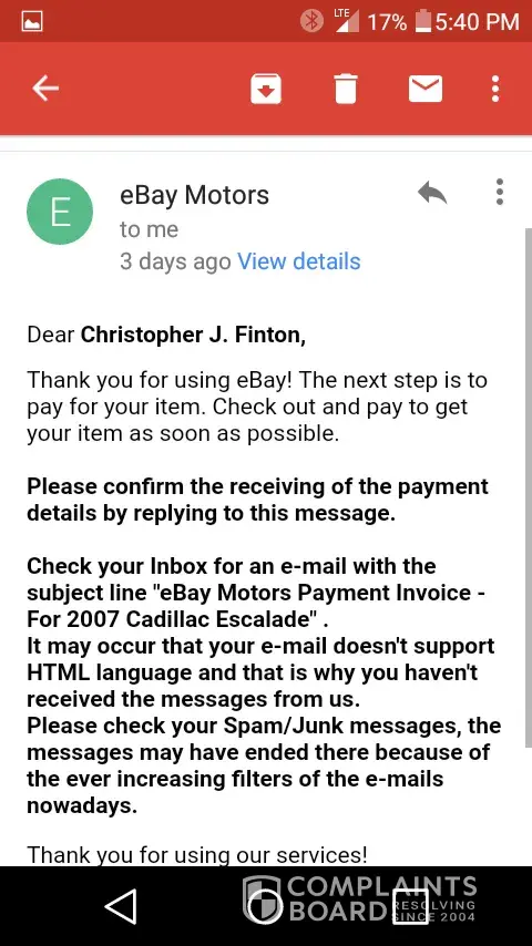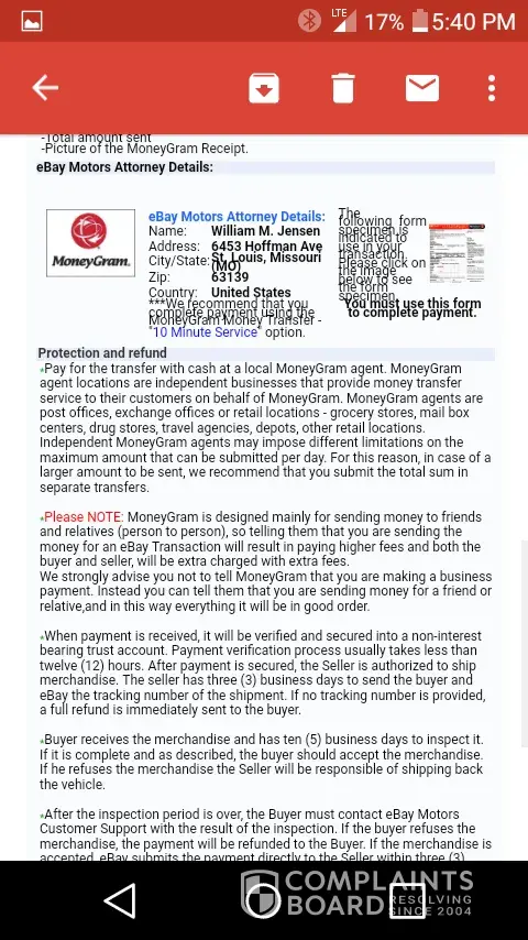 I contacted Mrs. Casey in order to purchase an suv that she had for sale on your site. She sent me information on how she would like payment and directions on how the transaction would work. She said that she was working with the ebay vehicle protection program. That we needed to send the money via money gram to the ebay attorney. The attorney would hold the money until we received the suv and if we decided to keep it then the money would be released to her. We sent the money on Saturday and were told that in no longer than 24 hrs. That shipping would begin. We have not heard from ebay or her since we sent the money. We have called ebay and they said they do not work with monogram. So we no longer have our money and no suv.