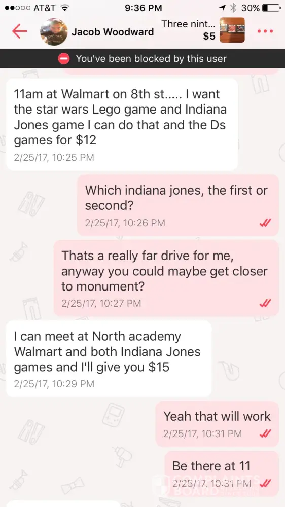 This guy and i had set up a place and time for him to buy some games from me. I gave him a 5 star rating the night we set up a time. In the morning he didnt show up and when i messages him later that day, he blocked me. So now i cant give him a 1 star review. I have reported him but it hasnt done anything. I have attached pictures of the conversation.