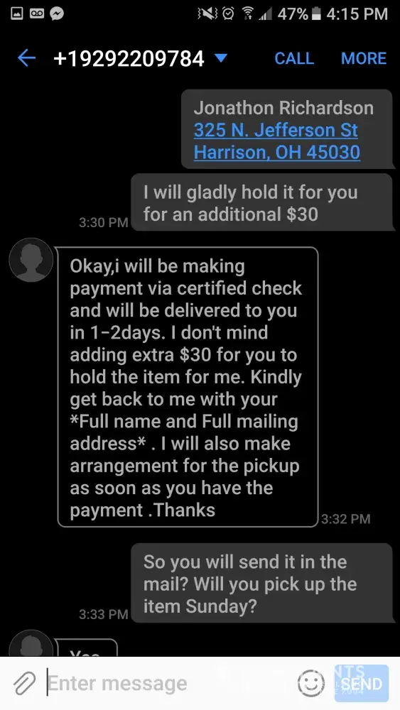 got scammed by an individual by sending me a bogus check saying they sent the wrong amount send the extra back.