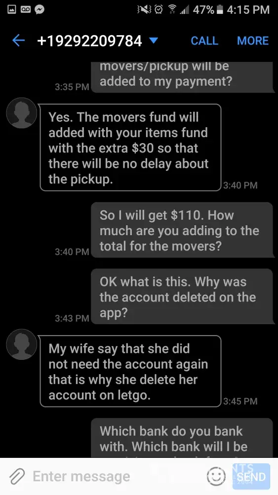 I was selling a iphone 6s and this guy wanted to buy it. We met up and SHE gave me counterfeit money and ran off with my phone. I chased after her but her getaway driver knocked me down and they took off. I called the police but nothing happened fast enough After i lost them and i couldn't find them i went to the police station and filed a report. Im never using letgo ever again because its not a safe app to sell products on.