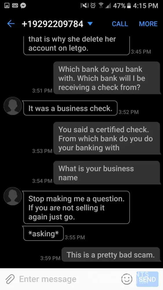 Sometime around or before September 21 2016, someone with the handle Larry Backus's contacted me wanting to buy a printer from me, claimed the lady who handles the checks accidently sent out the wrong amount on the check and asked rather than cancel the check and issue a new one for the correct amount, he said just send the extra back. I deposited the check into my account and after 3 days I remove the funds. I now have an issue with bank fraud and have no evidence to show the bank because Letgo not only deleted the scammers account. But deleted the entire conversation. With out that conversation I'm pretty much, going down for fraud. I did not intentionally fraud my bank with a bogus check. Is there anyway letgo can contact the Bank of Ozarks and explain I was a victim of a scam artest? I really don't want to go to jail over this. Need help.