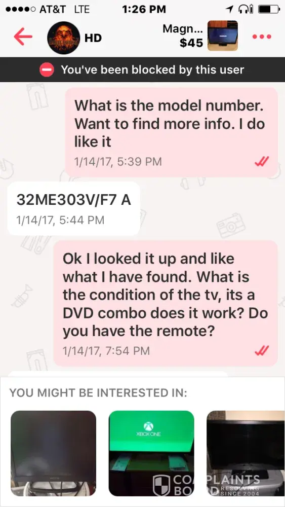 Told me he was going to give me a shipping notice. This person must be a scam. When I paid for the item through PayPal with my last dime to buy my grandson a gift. Paypal has fraudulent emails accepting money. Why is this person still selling for you on Letgo. He reposted my the TV and got my cash for my grandson's TV for Christmas. I am a recent military widow and I am very sad. Paypal should be responsible for this. He is not real he blocked my
