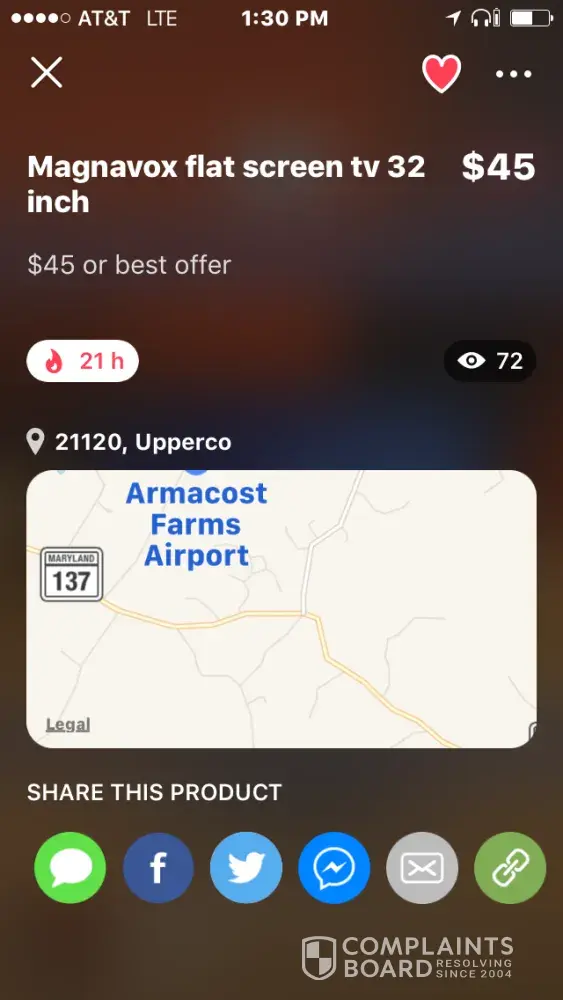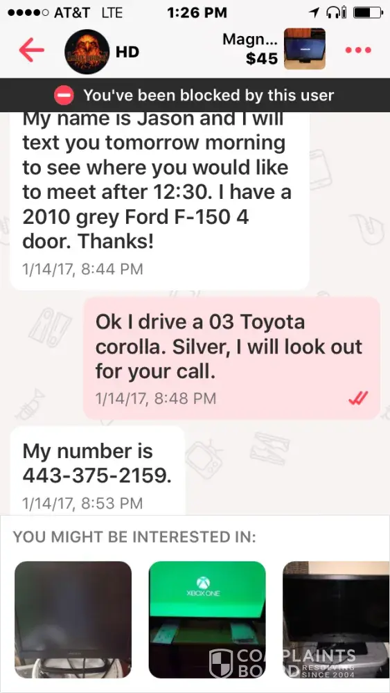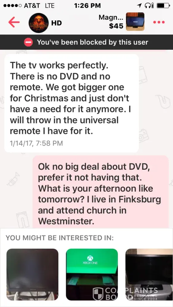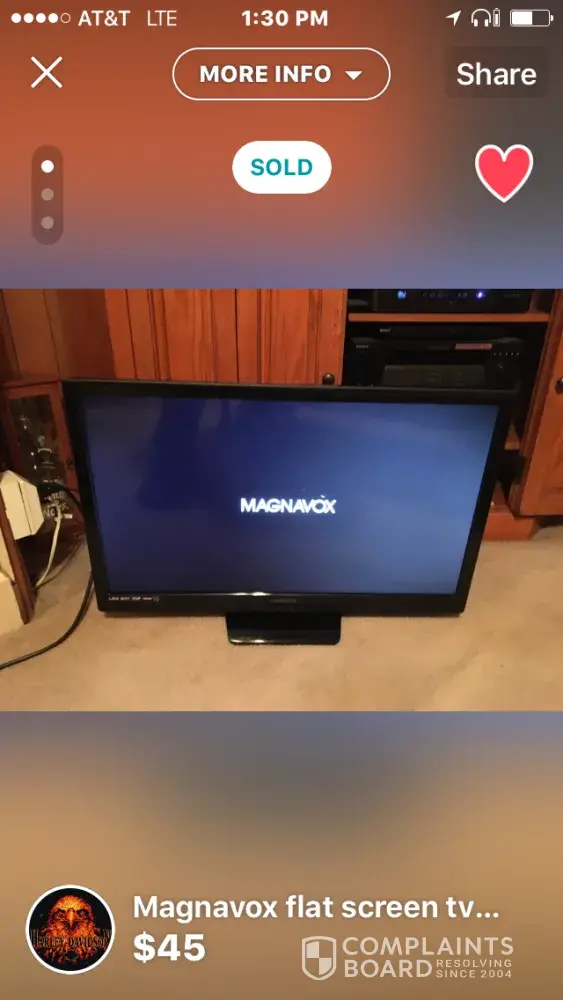 Meet up with jason in hampsted md. He informed the tv was good and his picture was fine. Was not told that the coax connector was broken off. Did the transaction before finding this. His phone number is [protected]. I got burnt. Do not trust this seller. He immediately put a block on me on his selling page. He also did not mention that the screen was scratched. He knew were I was coming from and that I was in my way but treated me like I wasn't getting their fast enough. I told him was would meet up after I got out of church. I am hoping it even powers on. I have phone records and text records along with letgo chat. This person is a liar and cheat. I would like a return of money if possible. My letgo name is steven peddicord. I was told everything was working. Goes by hd and has a pic of an eagle head. See photos added.