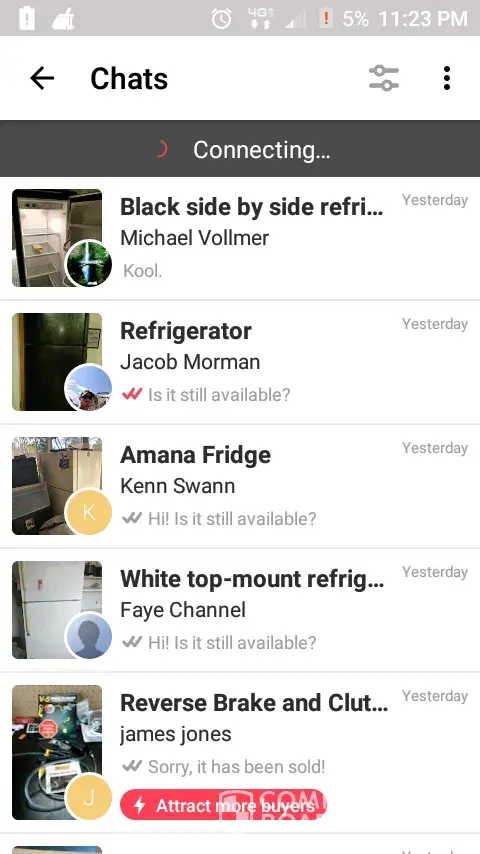 I should be reimbursed the money I've had to pay on a renta l. Last refrigerator that I could afford was sold because I couldn't reply to her in the morning. I already had it and she thought I stood her up because chat wouldn't connect. Really loved this app but not any longer. I have tried everything and it's still not letting me chat. Whats the point of this service if you can't make any transactions?