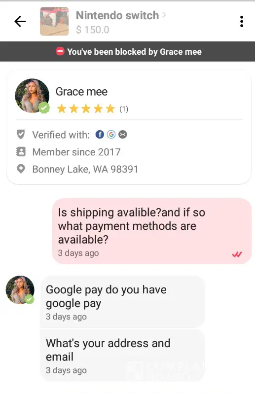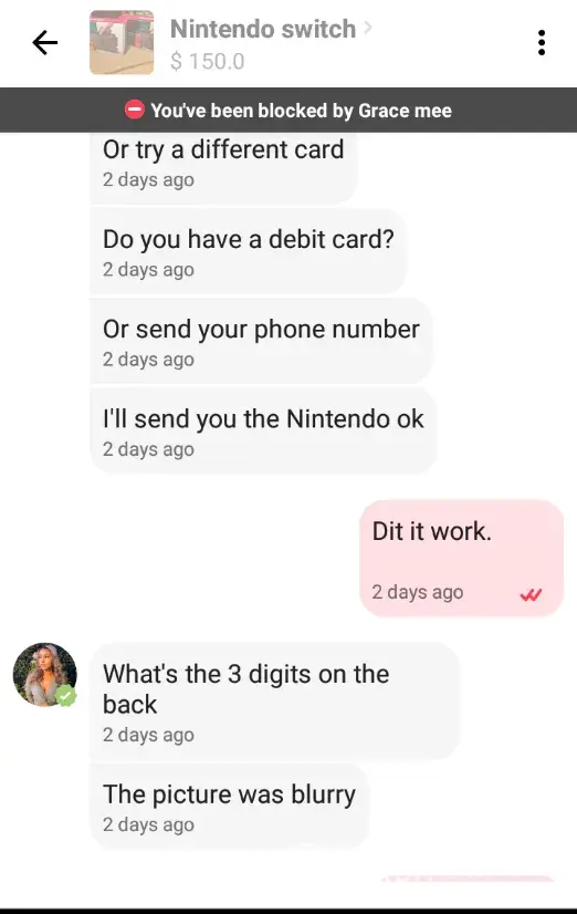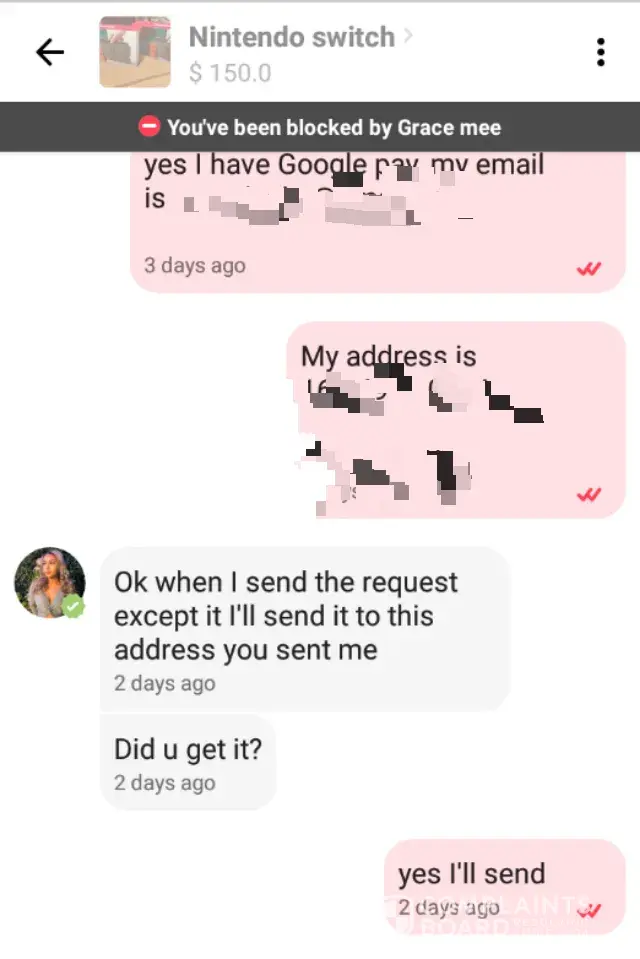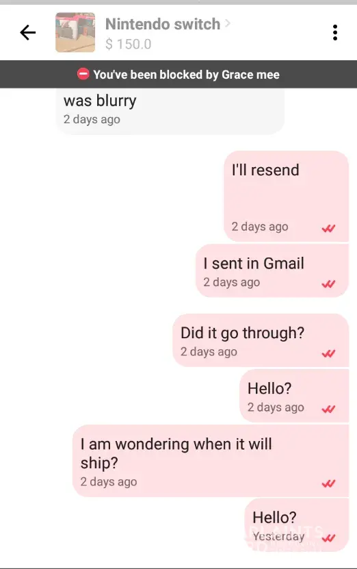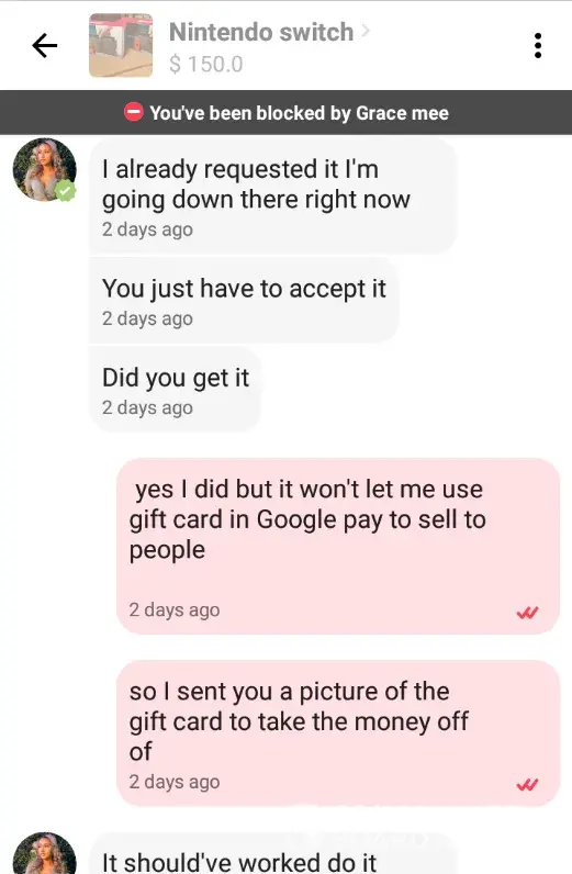 The especially interesting thing is that 4 days ago when I paid for the Nintendo Switch, the AirPods were still listed as available. Im guessing that if this was actually a scam, the seller was listing these things, accepting payments from 3rd party services like Google Pay, and then blocking the users that paid them so they could continue on "selling" the items a few more times.