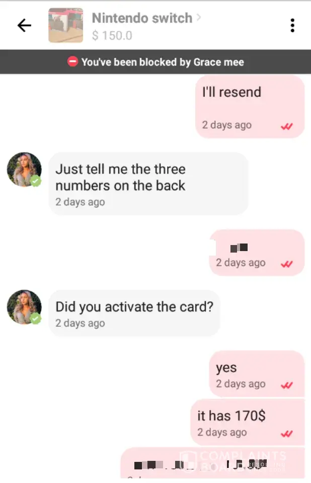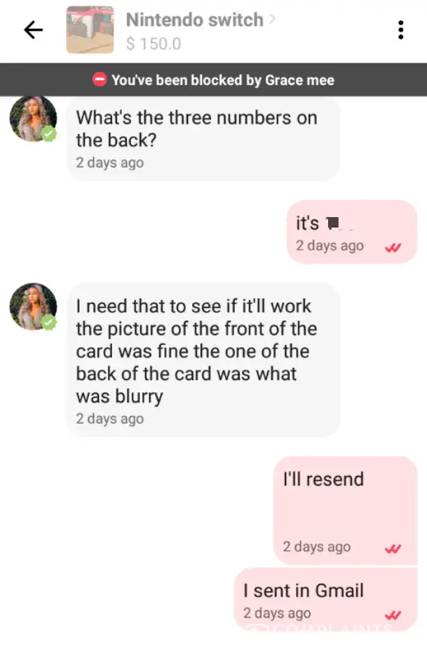 I'm 14 and am thinking of getting into resale. So I was looking for a Nintendo switch and found one from user: Grace Mee for $150. I bought a $175 dollar Visa vanilla gift card and sent the picture of it and the CVV, the extra was for shipping. After checking online I confirmed $165 was taken off and sent to a PayPal account. She explicitly stated I'll send it to you and then blocked me after receiving the money. I'm 80% sure this is a scam because I'm now blocked. But I am wondering how she has 5 stars on her account and a review. That's the only reason I bought from her. I am wondering if someone at LetGo can message her since she has a verified phone number. The pictures are in no order and I have more on my Gmail. [protected]@gmail.com