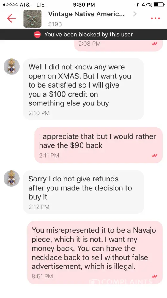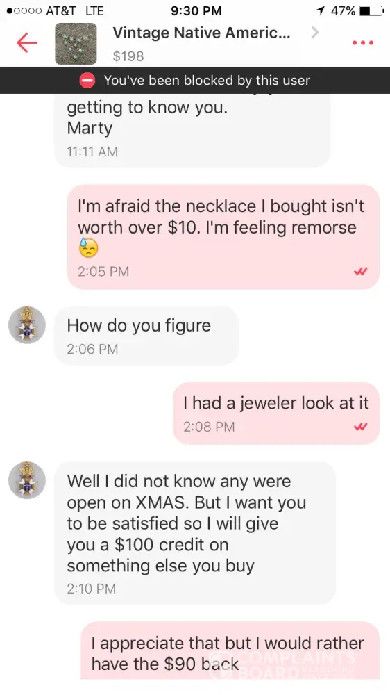 A man named "Marty" in Gainesville, Florida has an account called "Gainesville". He sold me a necklace he listed as a " vintage Native American silver and turquoise necklace" for $100 (originally listed as $275). It turns out to be costume jewelry not worth more than $10. I expressed my remorse and told him I would like my money back. He refused and blocked me so I can't even leave a review. It makes me sick that he's going to continue to rip people off.