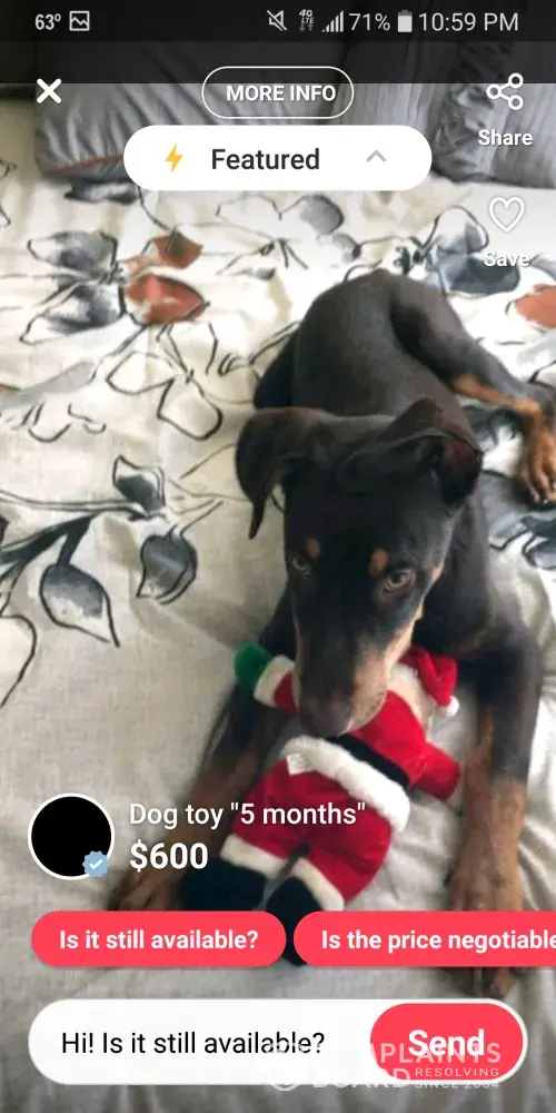 This person is selling his puppy on letgo! You have lots of people selling there animals on letgo. I report things like this but it never gets taken care of. I still see posts sometimes and then they are marked sold. They disguise there posts so no one from letgo can catch them.There needs to be another way to report things like this.