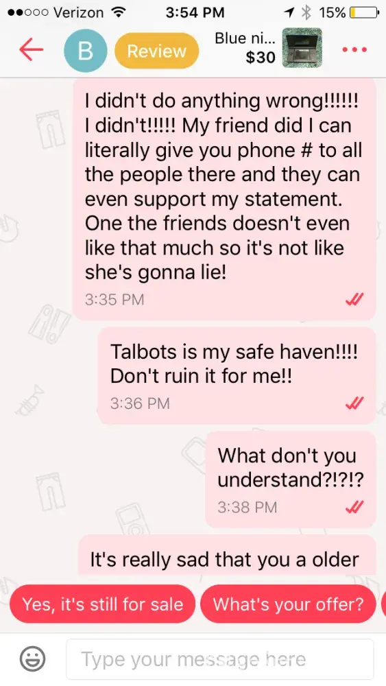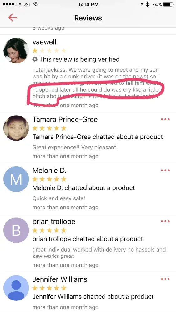 a kid insults a dead family member of mine after i asked "how much would you take?" (it said negotiable). then he reviews me badly, and blocks me so i cant review him. how the hell is that fair, letgo staff? its not. im gonna go to the BBB if this isnt cleared up fast.