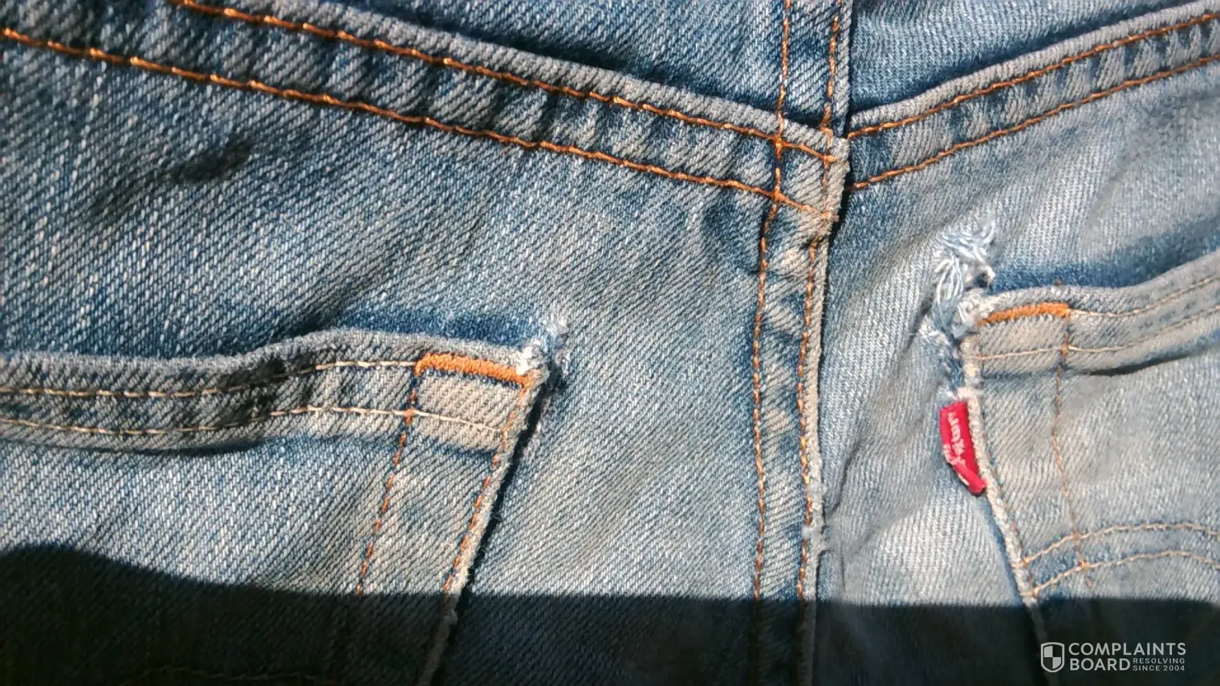 levi pants tearing in the same spot on 5 pairs. left rear pocket top side.