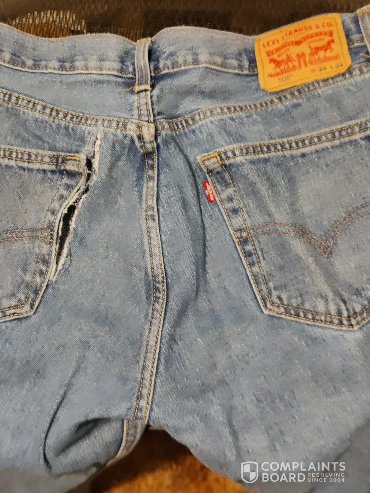 I have been wearing Levi jeans all my adult life, 50+ years. I have two pair of 505 jeans that have tears at the back pocket. These jeans have bee washed less than 5 times each. To say I am disappointed is an understatement. I have never any other complaints about Levi products and they are my preferred jean. I can see by the number of complaints that this is a Levi quality issue. I do not have an original receipt. I am requesting a refund for two pairs of jeans.