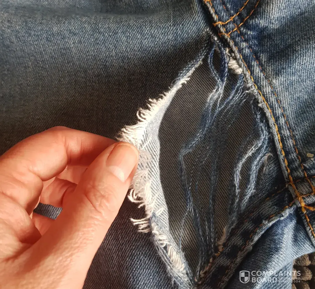 Contacted Levi's customer service to report the problem with photos...the response below; 2yr warranty, send them to us (of course at the customer's cost), etc. And maybe we'll make it right, if not however Levi's won't send the jeans back unless customer pays! This is not the first time I have unknowingly bought defective jeans - several years ago they developed holes around the back pockets after only 2-3 wearing/washings!