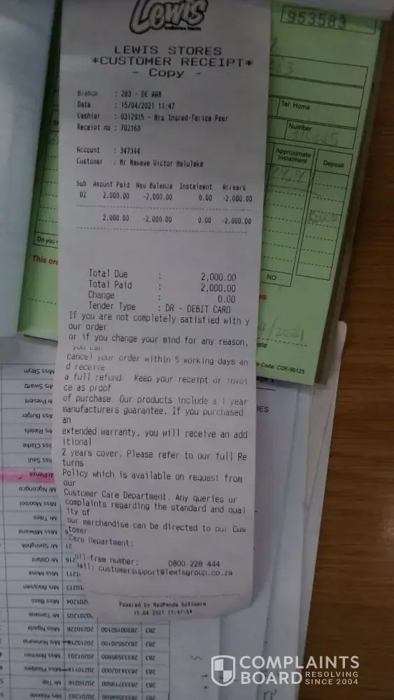 My sister went to Vanderbijlpark Lewis to confront them about the statement and they told my sister that they will look for the documents.