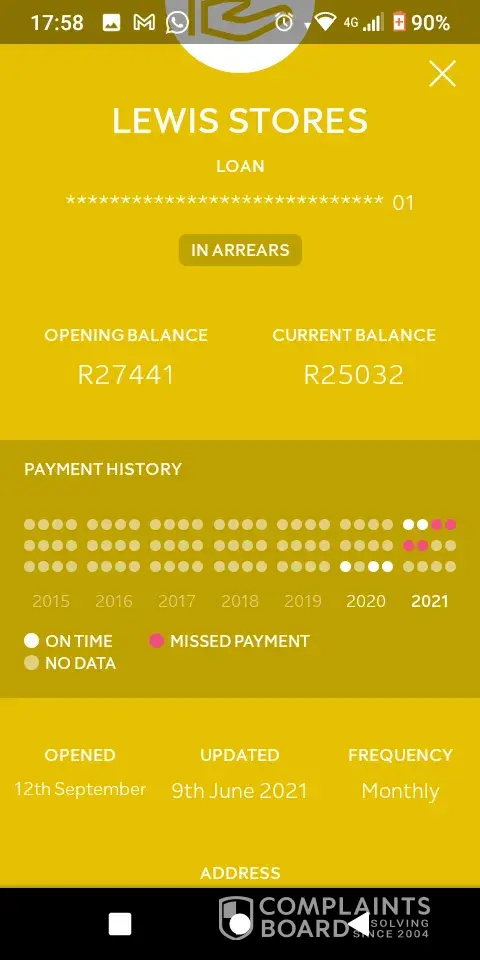 Good-day to whoever it may concern last year on the 12th of september 2020, i took furniture at lewis store in pretoria hercules, my opening balance was r27, 441.97 before the dedutions were made, they started deducting on the 19th of october 2020 the amount of r1, 481.74, i have never missed a payment yet my credit score says i have missed four months without pay lewis store and my balance should show some changes yet it says my current balance is r25032
