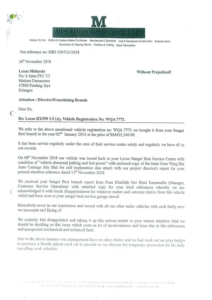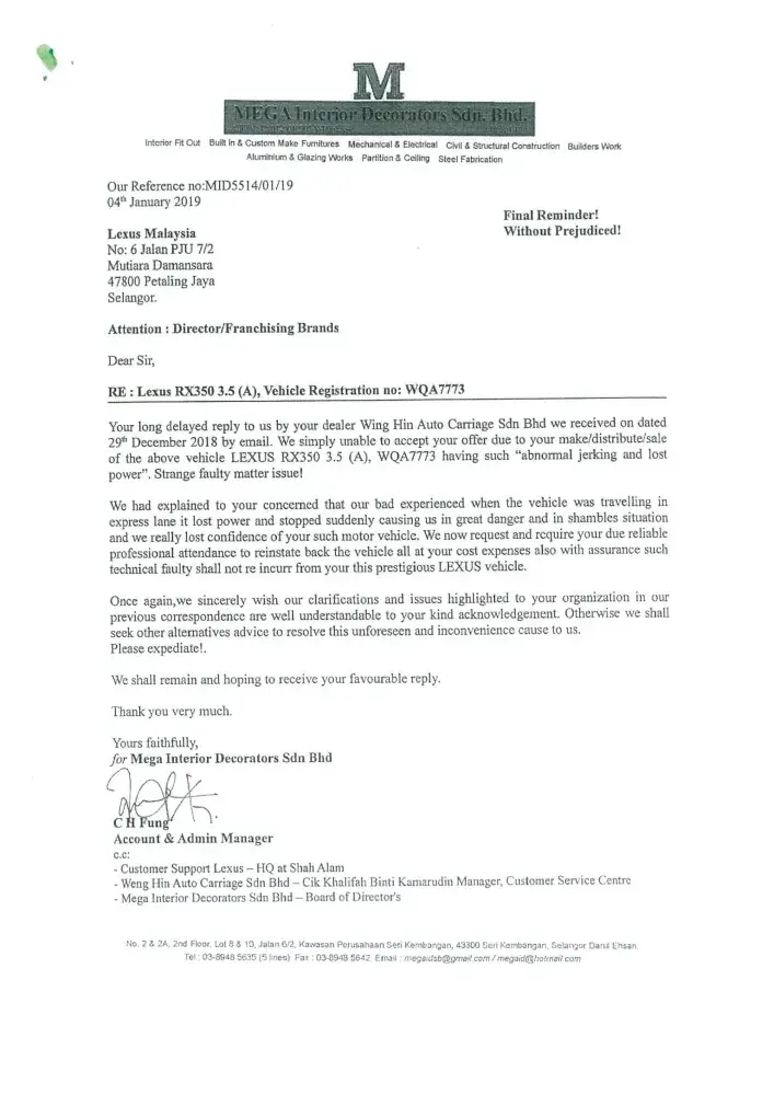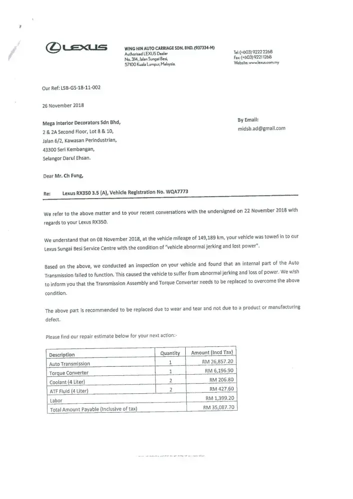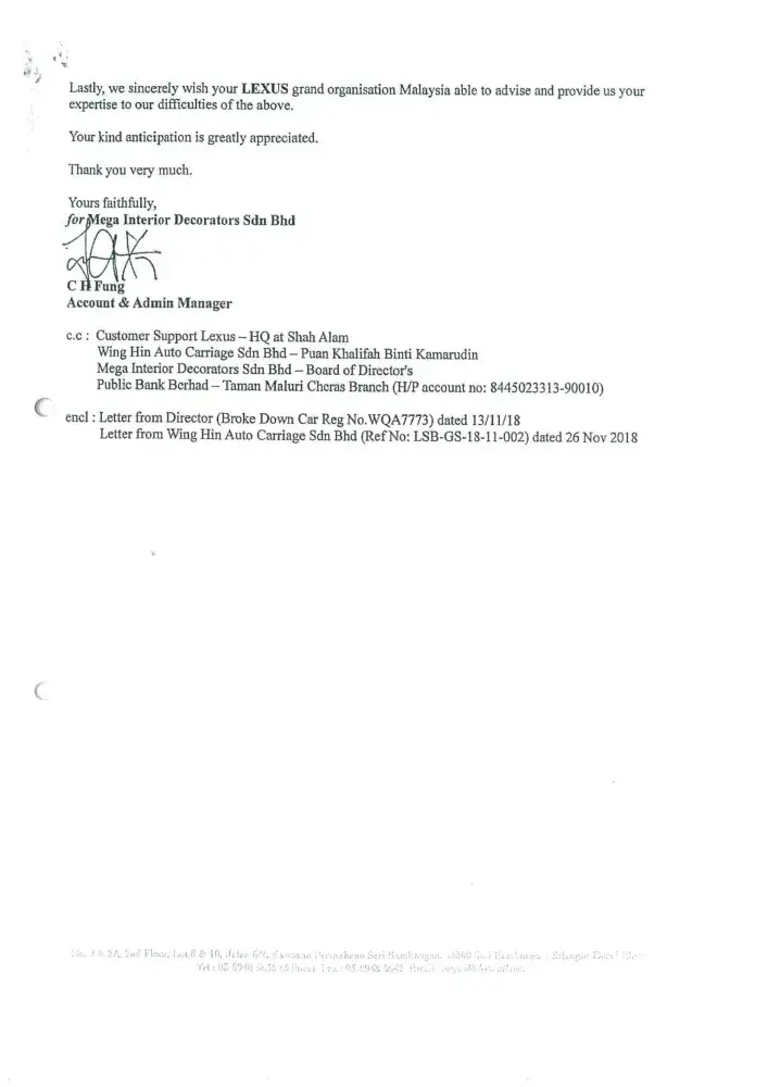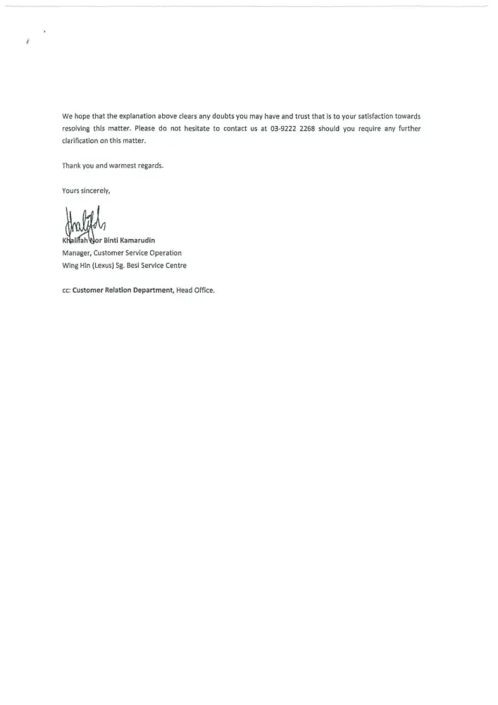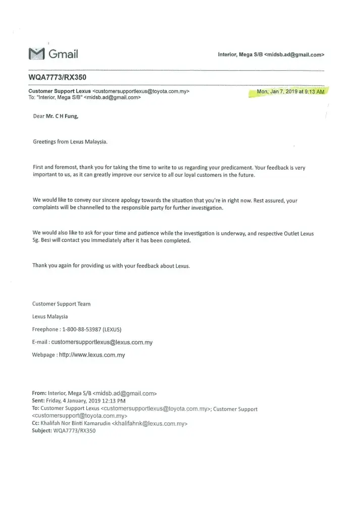 We are now totally lost confidence with your prestigious brand name LEXUS vehicle. Once again we sincerely wish our clarification and issued highlighted to your organization(Japan) with enclosed of our letters and your dealer's letter as stated below: