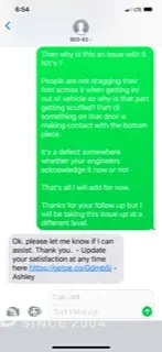 I found an 8 inch area of scuff marks on left lower frame where driver door meets the frame. I took it to dealer as I didn't want the issue to get any worse and get into the paint. Dealer summed problem up by stating that I scuffed my shoes as I got in vehicle. Ridiculous! My shoes don't touch the frame of the vehicle as I enter or exit as I am a perfectly...
