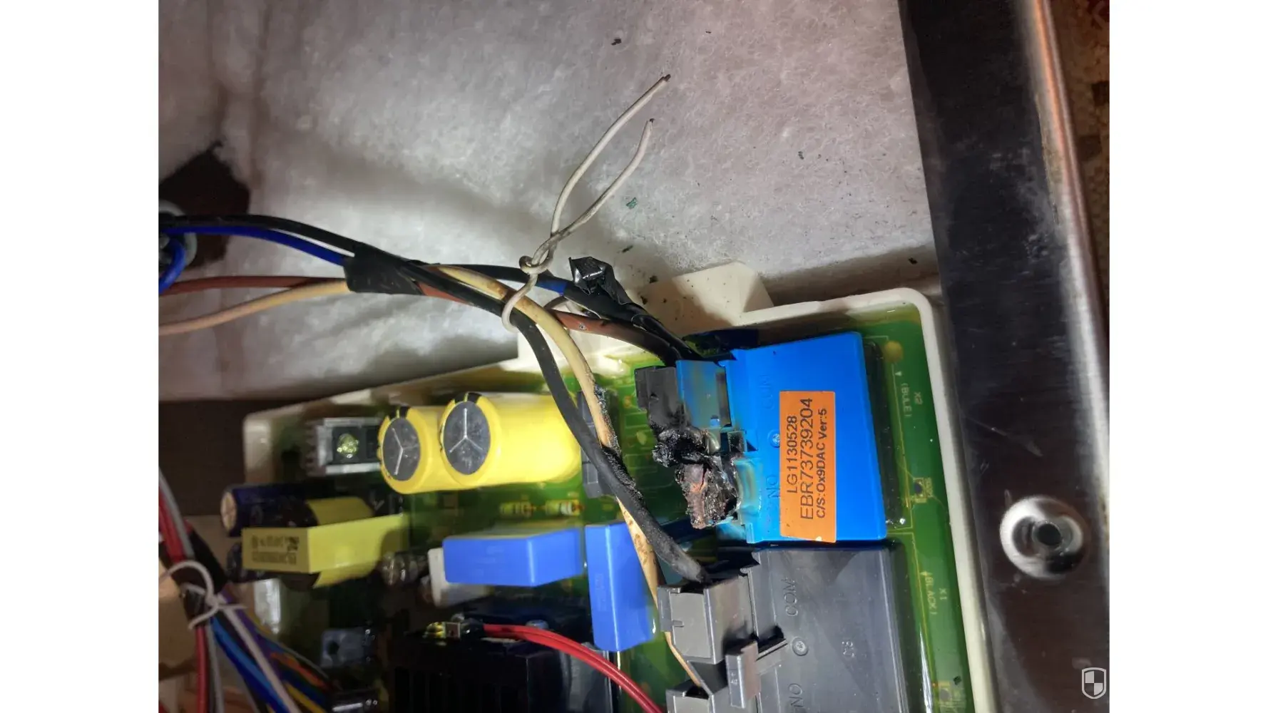 Waiting for second repairman. Dishwasher caught fire in the junction box at the bottom of the door behind the same small silver panel. First repairman told me it was mice that caused the fire. I laughed at him. I couldn't help it. There's no room for mice in that little silver junction box with all those wires and wire caps. Just ridiculous. No signs of mice, no poop, no chewed wires and no electrocuted or burnt mouse body. LOL I called Home Depot and explained what the first guy said. Now they are sending the LG technician. Our fire also happened at 2 am while using the delayed start option. Good luck everyone.