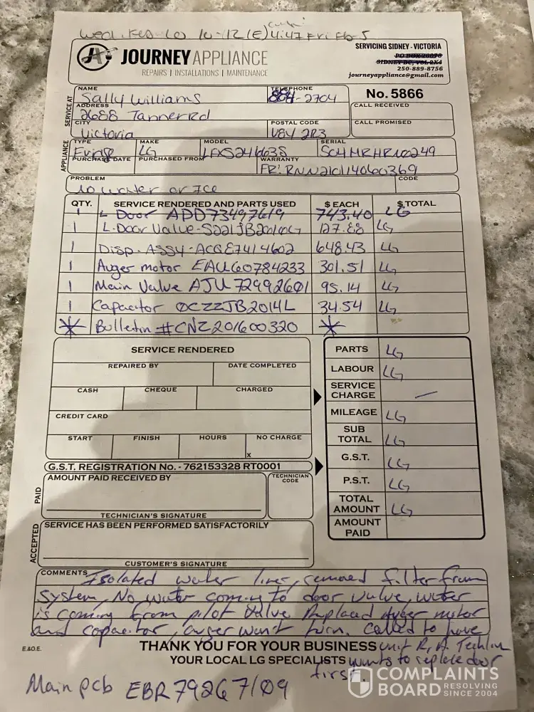 Hi I had a replacement compressor which was under warranty and replaced with no problem by Cam at Journey Appliance in Victoria BC. In January we called Journey as our water/ice dispenser stopped working. We paid extra for the LG flat rate option and a replacement door was sent. The door was sealed with insulation so water could not flow to the dispenser. Another door was sent in March and it didn't fit. By this time Journey were frustrated to say the least, and justifiably so, as they were having to pay upfront for all replacement items and call out charges. I have contacted LG numerous times with promises and apologies but so far we have not moved forward. I sent an email to LG recently, as I thought it wise to try a variety of methods to communicate, with promises to reply as soon as possible. It is over 6 weeks and I still haven't heard back. I will be happy to supply you with further information including call out notes from Journey to substantiate the information I've supplied. My email [protected]@icloud.com [protected])