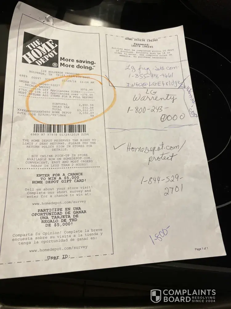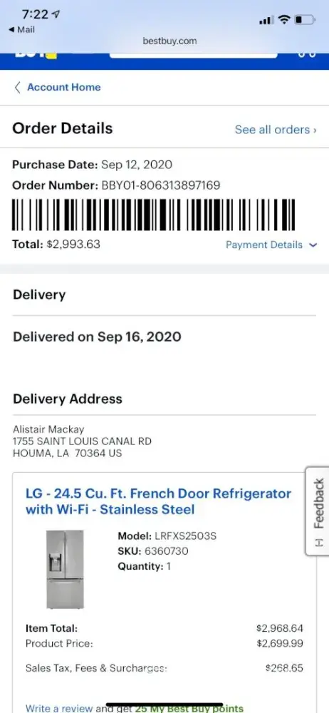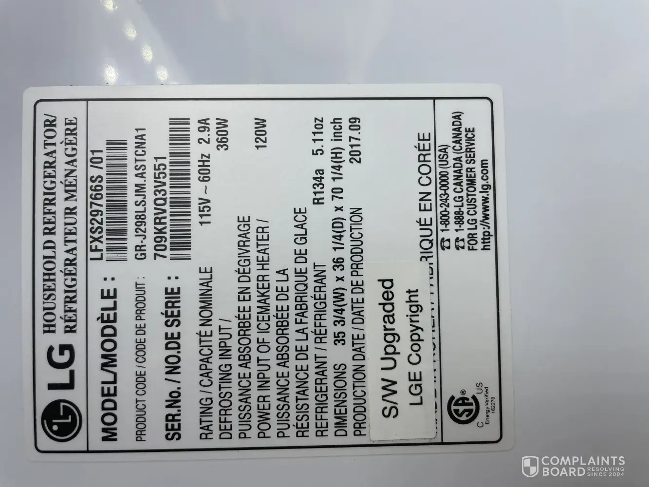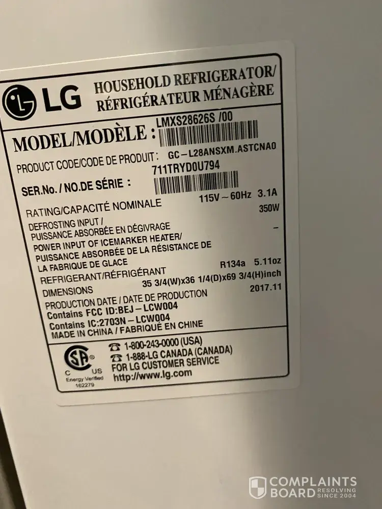 Model: LRFXS2503S from Best Buy. I paid $3000.00 and only got 13 months use out of it. Every appliance service company here in my hometown refuse to service LG (I understand why). Originally I wanted a simple repair, then replacement, now I'm seeking a refund due to delayed repairs.