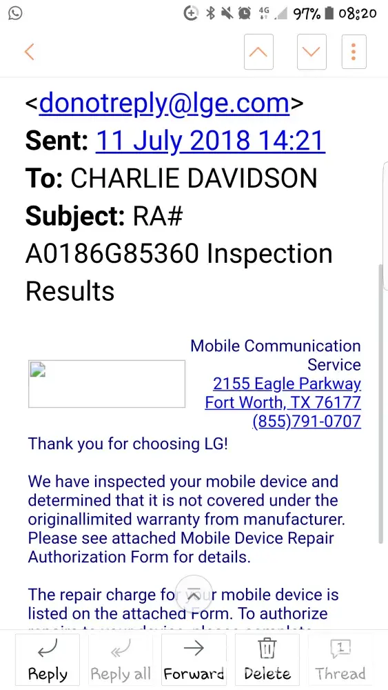 Looking at the reviews on the internet, it is obvious this is a standard response from LG repairs. I have to pay $20 to get my phone back for a second opinion or private repair!