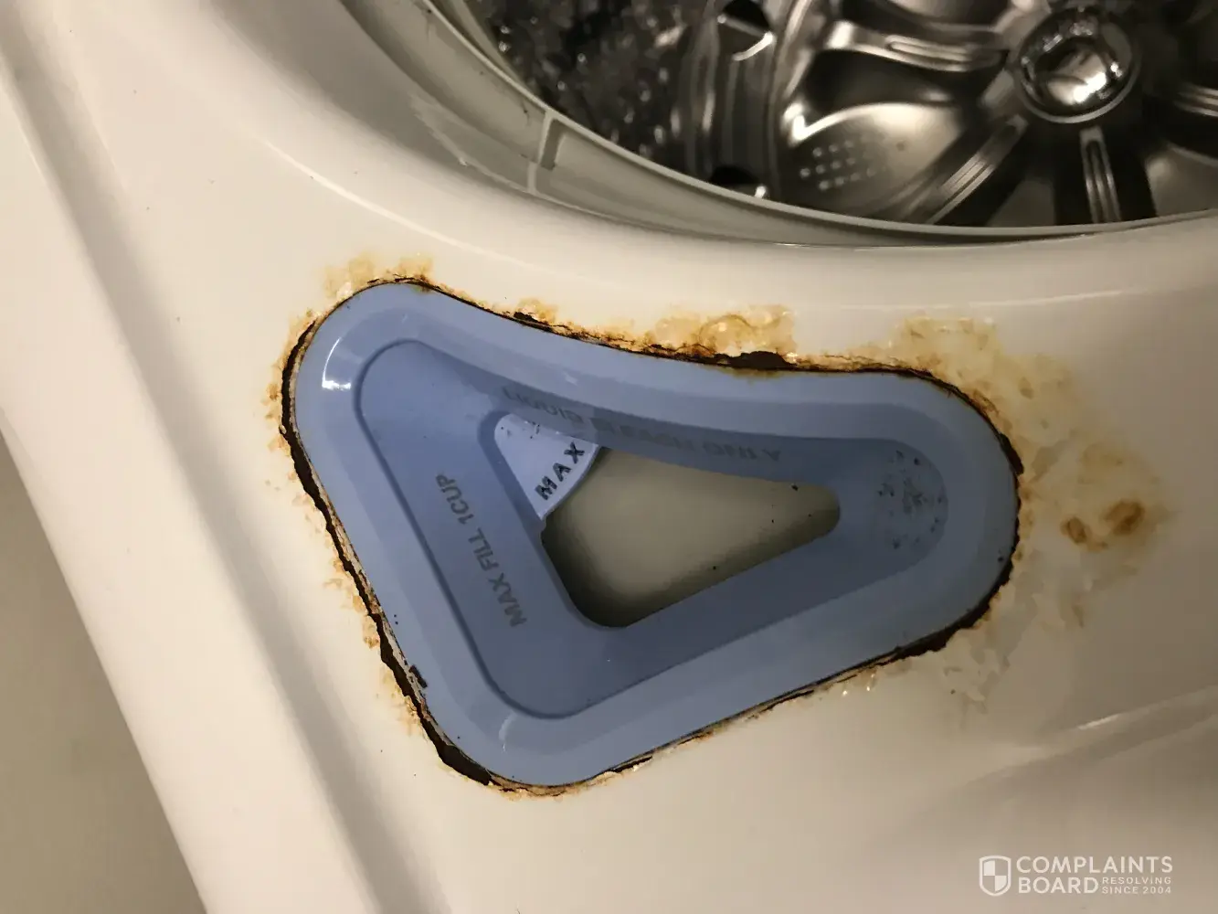 Purchased washer from Home Depot with 4 year extended warranty on May 19, 2012. Within the last 2 months we noticed that the the surface around the bleach dispenser was starting to bubble then starting to corrode. We've tried on 2 occasions to speak with someone from customer service but could barely understand the person we persons we spoke with. Both times it was someone from the Philippines.