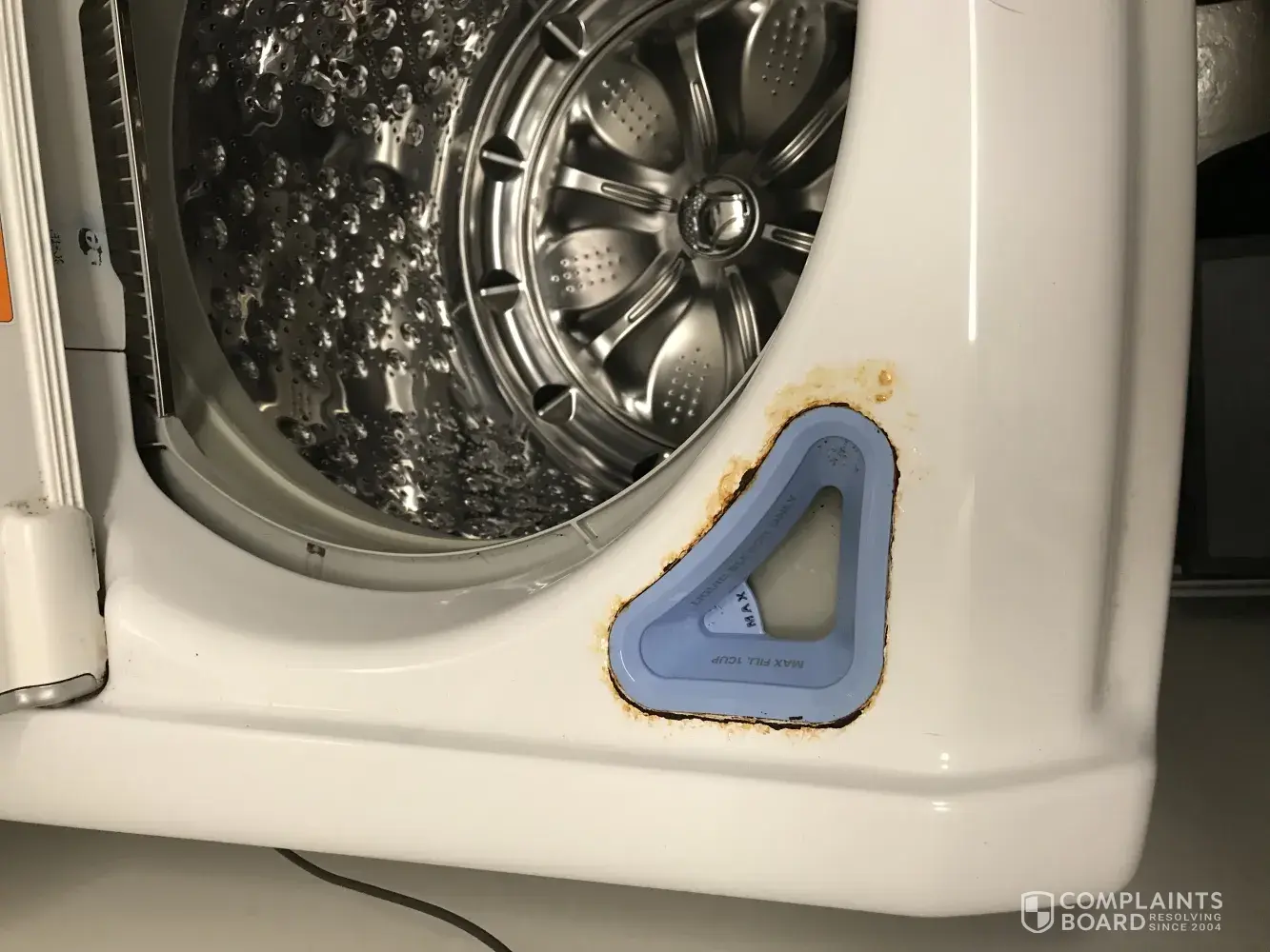 I bought this washing machine and dryer new from home depot on August 2012. I also purchased a 5 year extended warranty on both items. I had repair men out several times for both appliances. The washing machine started to rust within 1 year but I was informed that rust isn't covered by the warranty. The rust has gotten so bad that I am faced at buying a new machine because it has transferred to my clothes during the washing process. This is unacceptable. I would the part replaced free of charge including installation. I do not believe this is an unreasonable request. A washing machine should be able to take water without rusting! It has been in the same location, a well vented laundry room since purchase.