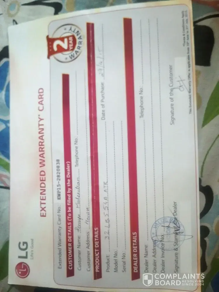We purchased an LG 32 inch TV in April 2015 from LG showroom in Noida under a scheme of 1 year warranty and 2 year extended warranty.And since then we have been on a ride.( We bought it from LG showroom though we were getting it cheaper at other dealers because we unfortunately trusted the brand LG)