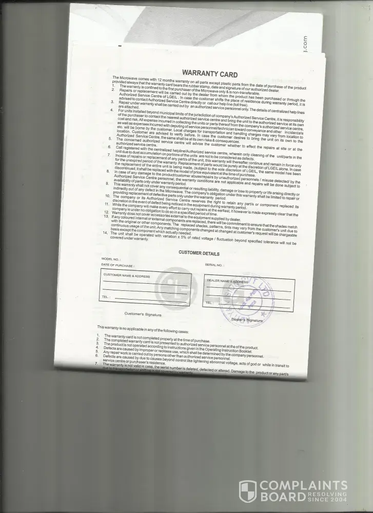 I purchased microwave Oven date 26/01/2011. I don't used Oven regularly but he is not working. I complained Lg Service Center but not response me.
