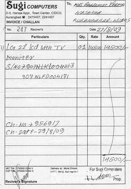 LG OFFICE AT JALANDHAR for delivering me a LG home theatre HT -924. RECEIVED ON 26 OCT 2009 BY