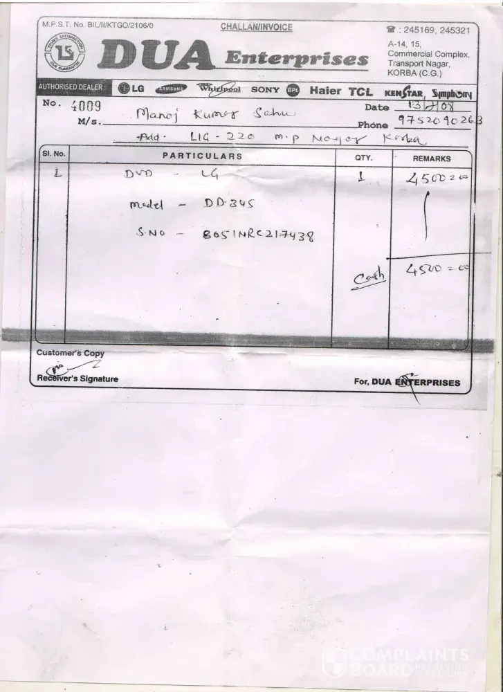 I purchesed lg dvd player model-dd345, sr-n0-8051nrc217438 from dua interprises korba bill no-m. p. s. t. no-bil/ii/ktgo/2106/0. on 13/07/08.