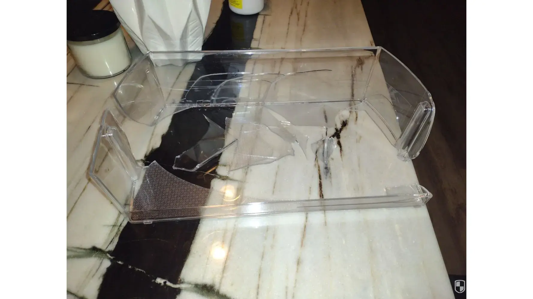 Our LG refrigerator shelf cracked and fell last week. Never seen anything like it. The plastic sides simply broke! Nothing unusual about the shelf load: a few plastic bottles, pints of cream, butter, cheese. Ordered a replacement shelf (over $100) and it arrived with the sides cracked and the glass shelf detached.