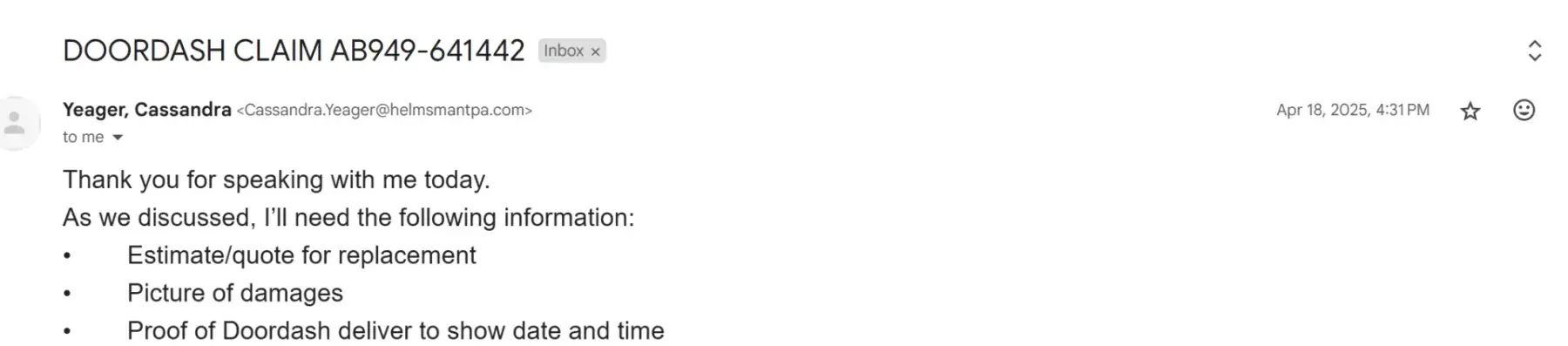 Helmsman Management Services, LLC, a division of Liberty Mutual, is impossible to deal with when you have a claim. With Helmsman Management Services, LLC, it was over a month before they responded and then toldme what I sent then was not enough. They are working for Instacart so Instacart is also a responsible party in this. A simple 200.00 claim for a...
