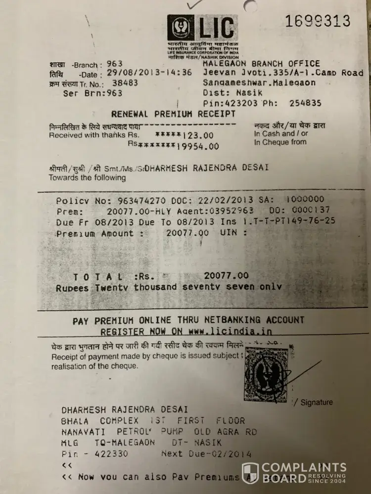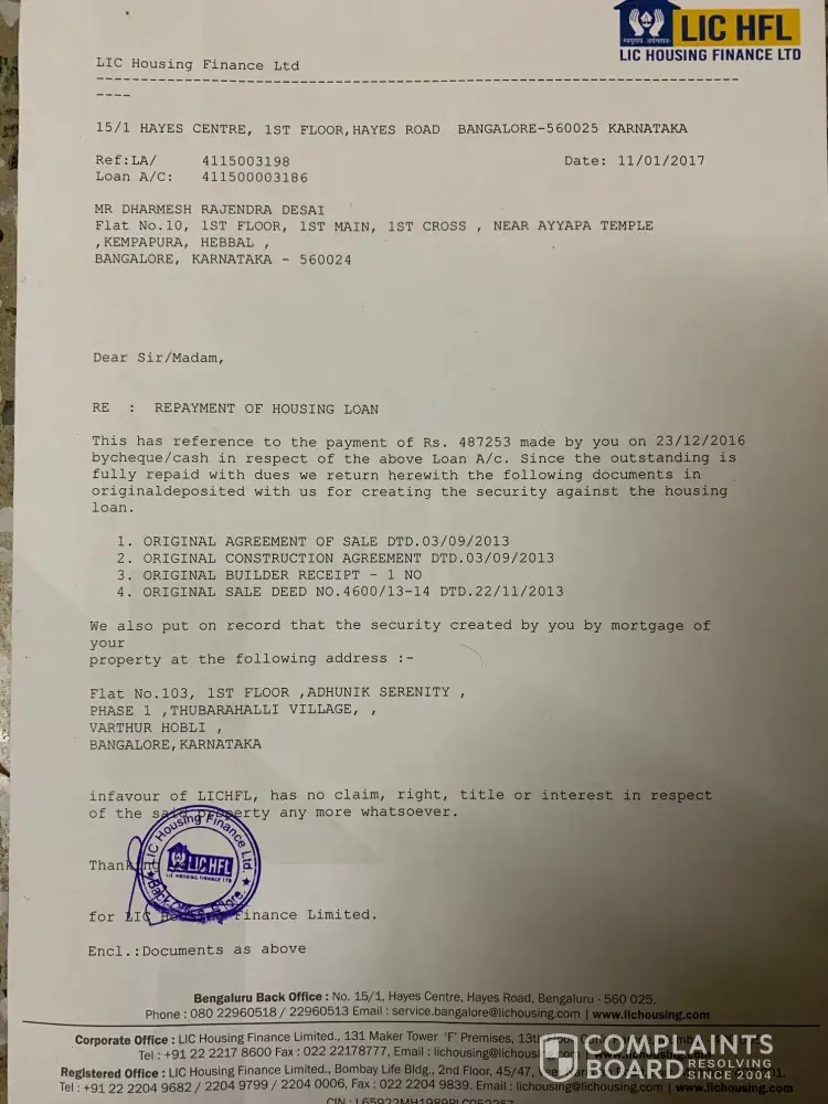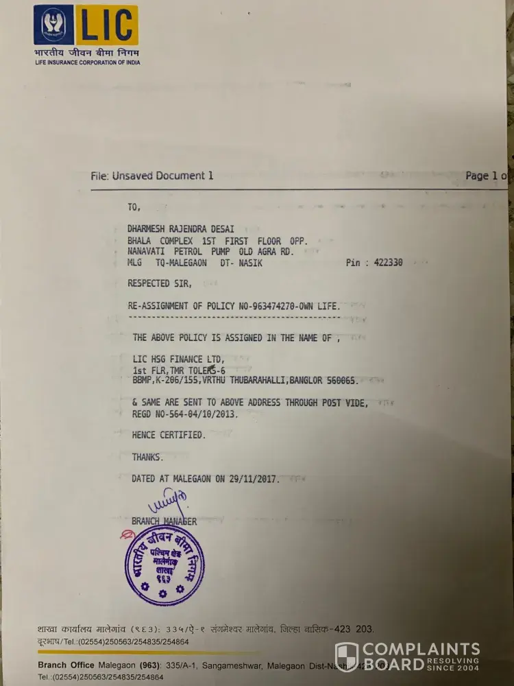 I am Dharmesh Desai, I took a home loan from LIC HFL Bangalore which I repaid completely on 23/12/2016. For this home loan, I submitted my original LIC Insurance policy ([protected]) as a mortgage at Malegaon LIC office (Please find the policy assignment letter). After full repayment of Loan amount, I received all other original document except original LIC policy which I used for mortgage. I am going forth and back to LIC Bangalore and Malegaon office for my original LIC Policy but I am not getting correct answer.