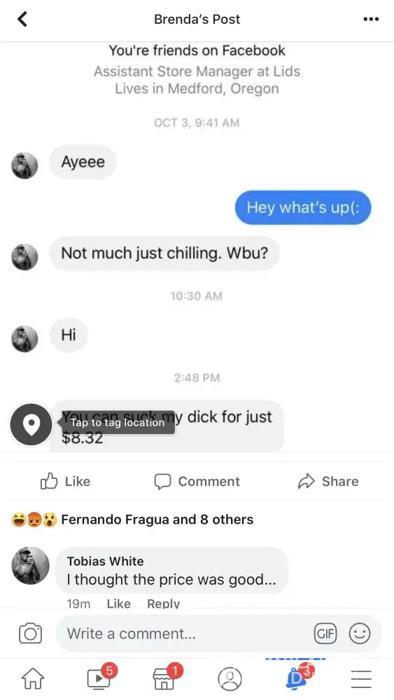 I am sorry to have to write this complaint. I have recently received from a co worker of your company sending me a very disrespectful message who represents your company that made me very uncomfortable yet he continue on with the comments and when I shared to my friends such rude comments. I have a few people saw he was a manager, as it says clearly on his profile. It's internet bullying and being disrespectful with sexual comments that shouldn't be said in the first place. I have no idea who he is but it doesn't look so well having someone like him to represent your company. I'm very upset, I have no idea who he is. I have family who saw this and lots of friends were not happy especially seeing he is a manger at Lids. That's all I have to say. Thank you.