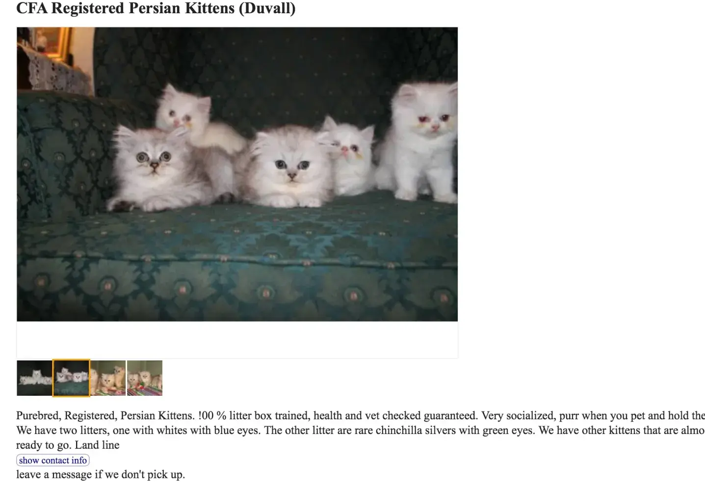 Now I see more adds from the same person. Please do not support this establishment. Feeling sorry for the kittens and buying them will only enables her to create more babies that will need to be rescued.