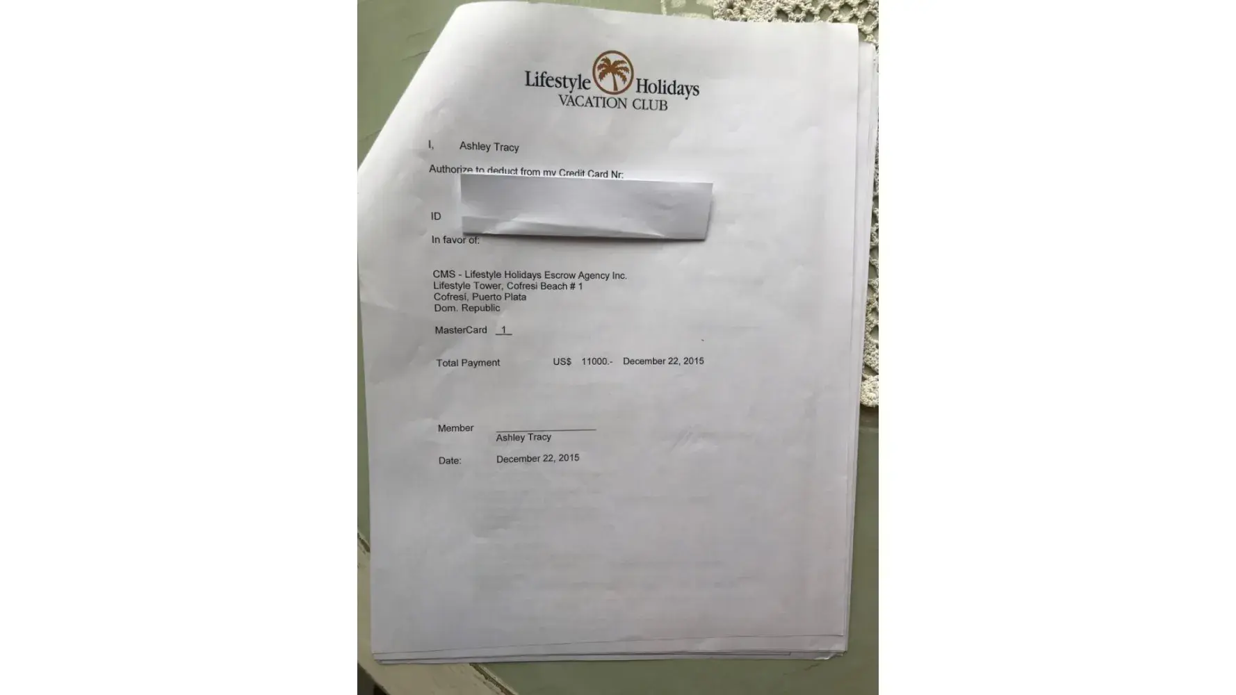 I was away on a cruise on 1/12/23 and did not have access to my emails when the document was sent, my credit card charged and documents supposedly signed. I figure Lifestyle Vacation Club must be responsible since they had my credit card from reserving a week at the Cabarete resort in the Dominican Republic. They also must have had a copy of my driver's licence from previous stays so used that for a scammed sign of documents. I was not aware of this, had no access to emails and could not have agreed to this. I had no idea LHVC was committing this kind of fraud. I had stayed there before and their sales tactics can be a little agressive for their resorts, but this is absolute credit card fraud. Hopefully the credit card company can get the charges reversed.