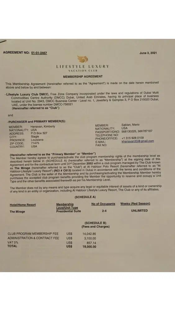 We booked the visit for February 17, 2023 and were taxied to Cofresi Beach and offered breakfast. One hour later, Olly came back and walked us to another representative, named Alta Gracia. Alta Gracia put us in a golf cart and for the next 5 hours we were taken around the Club and offered alcoholic drinks. We visited the rooms and apartments and the V.I.P benefits once we sign a Membership contract. The Membership, as she presented it to us, was one time payment of the Membership and the tipe of fees that we would be paying. We were also told that we would pay #$250 per week per booking of a Junior Suite which we said it would be enough for the two of us. We were told that we would have to pay $130/day/person for all Inclusive, because the Junior Suite did not have its own kitchen. We asked what happens if we have guests. We were told that there is the option to upgrade to a two bedroom or a suite, paying a difference on top of the $250 fee. We were also showed how the members can rent out their accommodation and make money. We were pleasantly surprised and we agreed to go to the office and see what is the Membership Fee. during the visit I was asked several times how much money/what is my Credit Card limit. Needless to say, when we did not want to pay $23,000, nor $10,000 for membership so then a Manager named Junior showed up and offered a Tryout Package Deal for 23 weeks per year for 25 years, for $4,600 one time payment. We agreed and were signed the contract with what we thought to be the benefits and the flexibility presented to us at the time of the visit of the premises and accommodation options. We were offered an envelope with all the magazines and a CD presenting the properties in Mexico, Dubai and Cabarete where we said that would like to most likely book first, taxied back to to our place. I took a second look at the contract are realized that I was not given the Rules of Occupancy, but I thought it would contain regular conditions like you have at an AirBNB. Monday, February 20, we had the Orientation Video Call while we were home in Canada with Gerald Vincent. So this was when all the restrictions came out of the woodwork, and we were told that it is 23 weeks spread on the 25 years, which would make almost one week/year. There were a few other things that were misrepresented to us at the time of the tour, so I just stated that we want to cancel the Contract. We were told that as per the cancellation policy (which was never discussed at the time of the contract discussions) we are within the 4 days of grace period when we can cancel, but pay the $1600 admin fee. I said that I never saw the Cancellation Clause and and he said that it was in the Rules of Occupancy, whose hard copy we were not given. Gerald e-mailed me only the copy of the pages regarding cancellation policy where on page 31, under a paragraph called "Membership Agreement" (a second one?), at the very bottom of the page the conditions of cancellation are mentioned. I told him that it should have been part of the Contract and not of the Rules. He tried to offer us different other combinations, but at this point we had lost all confidence and trust in his words and realized that we were fooled into signing that contract. Anyways, we finished the video call with our unequivocal request of cancellation of the Contract and refund of our money. The request was never acknowledged and I was sent different kinks with username and passwords to access out benefits, including from InTrave'l Agency, that not only did not open but unsubscribed and blocked. After me blocking the InTrave'l Agency, Gerald Vincent sent me another e-mail wanting to have another videocall which I refused. I kept asking for the Cancellation and the refund. At a certain point he sent me a new Modified Contract with the flexibility that we wanted and 40 weeks for the 25 years. I responded that due to the Breach of Trust, we are not interested in any further offers from LHVC, we just want our money. Then later on, and after threatening that I will involve the Ministerio De Turismo and the Consulate in Toronto, I got an e-mail saying that they have reviewed the contract and that I had no proof of the Breach of Trust or any misrepresentation of the Membership benefits and they see no reason for me to cancel the contract. So, at this time, they are illegally holding on to our money, because even by their "rules" we were within the 4 days of the cancellation grace period which again, conveniently were not specified to be calendar days or business days. The whole contract is ambiguously drafted, on purpose, in order to confuse the potential buyer of membership. The $1,600 for admin has no merit seeing that there 6-7 pages of Contract Templates and there was a Saturday and a Sunday between the date of the signing of Contract and the Monday of the Orientation Call where we had already requested cancellation of the Contract. Unfortunately the document is in .pdf format that it looks like it is not supported y your system. I could attach it to an e-mail if you give me an address.