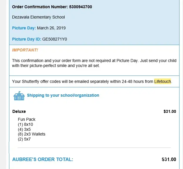 My advice... Do Not use LifeTouch. We won't be any more. We'll pay another (local) photographer to do our school pictures from now on.