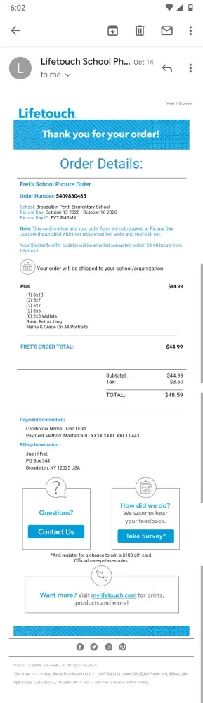 back in February of 2020 I ordered my both of my daughter's school pictures one is in kindergarten the other one is in 6th grade. They took the money off my credit card but I have still not received their pictures. I have tried calling twice and never got an answer. today I checked the mail and I had two big lifetouch envelopes in their got excited open them up and they were empty just a piece of cardboard in a paper telling me to order pictures.