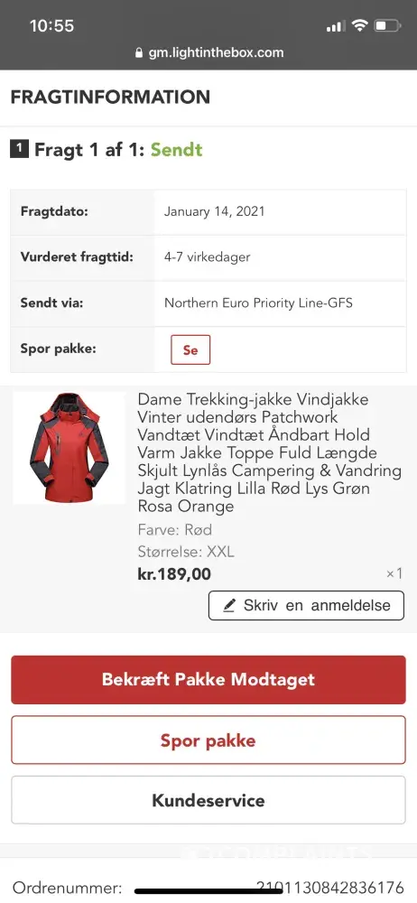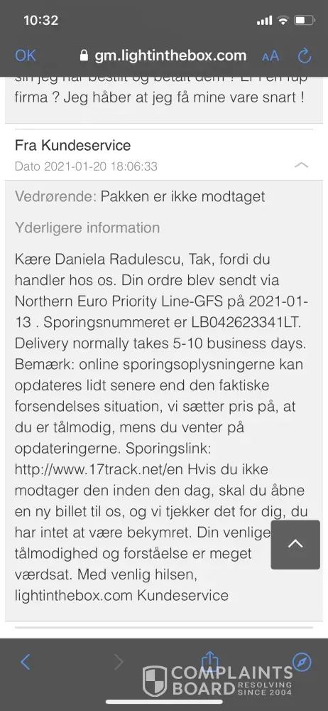 I have ordered 2 rain jackets and 1 pear of shorts from LightInTheBox company online, on the internet from 14-15 the of January and have no products or answer until now from them, I have spent 642 danish kroner which I can't prove! I just want my money back! 😡 It is frustrating because I got this shopping site from Google and I thought that is a secure place to buy, it's actually unbelievable because every time when I've tried to track my stuff they are closing the page, I can not contact them at all! So I hope I can get some help after this message! At least LightInTheBox to write me and say what is wrong! Underneath I have attached some pictures with my order!