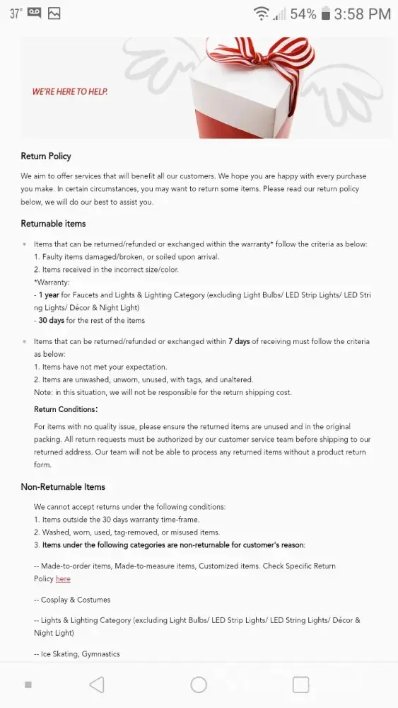 As far as their return policy goes, their website says 7-days as well as 30-days for items under "warranty". To qualify for the 7-day, items didn't meet expectations, can't be used/still have tags, and the 30-day "warranty" items are faulty/damaged or the wrong size/color. Neither listing for this item specifies which policy it falls under, plus my item is not the correct color as advertised.