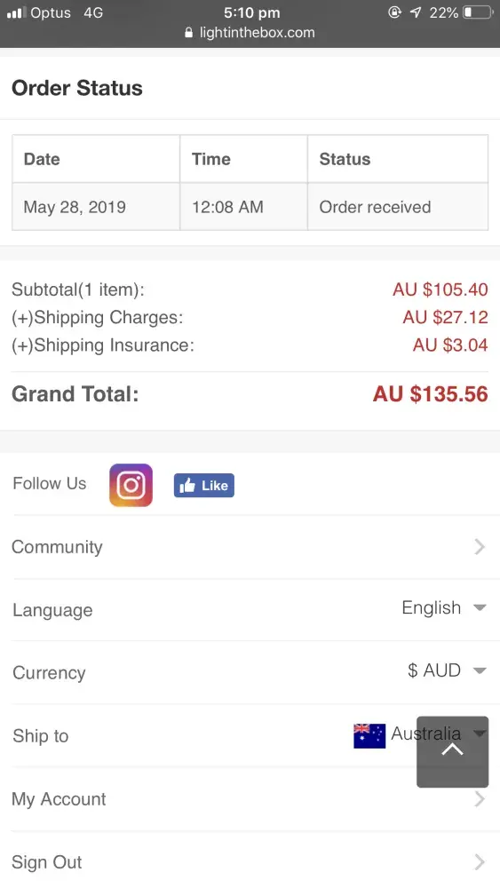 Absolute scam I bought an dress online and when it arrived at Royal mail they wanted 3 x the cost of the dress in customs so I was advised by Light in the box that let it be returned and when it arrives back in China they will refund the card, so I did and was told to wait another 6 weeks for refund I did and was able to track the parcel returning back to origin and then the order disappeared off their system like it didnt exist even though its on my credit card statement I am furious have being trying to do this weeks they keep saying I didnt buy anything on the 12Nov18 but I have proof which I have sent them and they are ignoring me.
