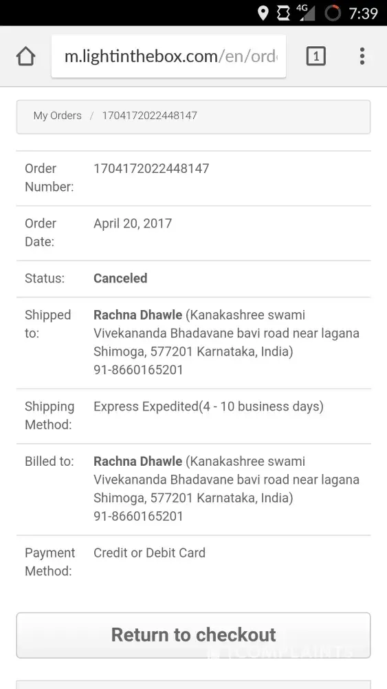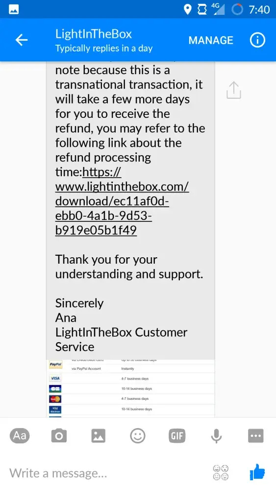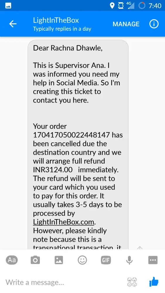5 May 2017. They proceeded refund and said that they will arrange full refund GBP58.87 immediately. It usually takes 3-5 days to be processed by LightInTheBox.com.