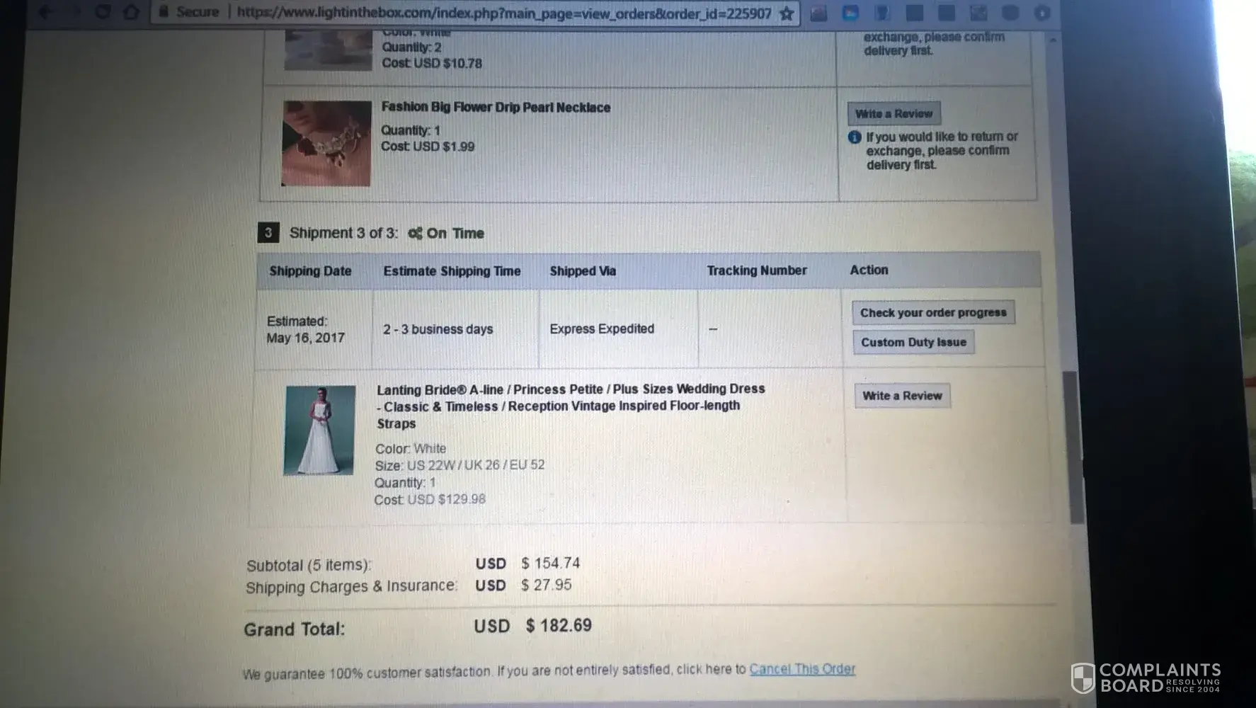 I ordered 4 items from Light in the Box. They are all in one order. First, one was shipped according to them. Then two more shipped according to them. Now they are telling me that all three of those items have been delivered, but I received nothing. The forth item, my wedding dress, has not shipped yet. The don't give a phone number for me to call customer service. I need all four items for my wedding. At this point I have begun looking for another dress and other needed wedding items. I just want to receive my entire order in time for the wedding, or a full refund including shipping since nothing was shipped.